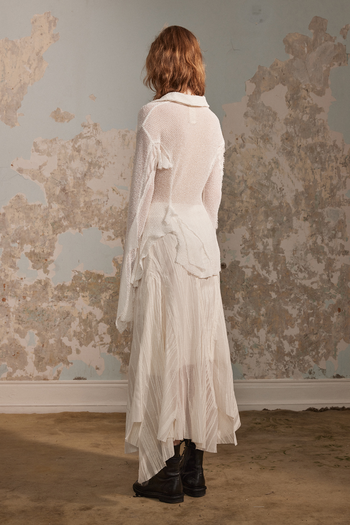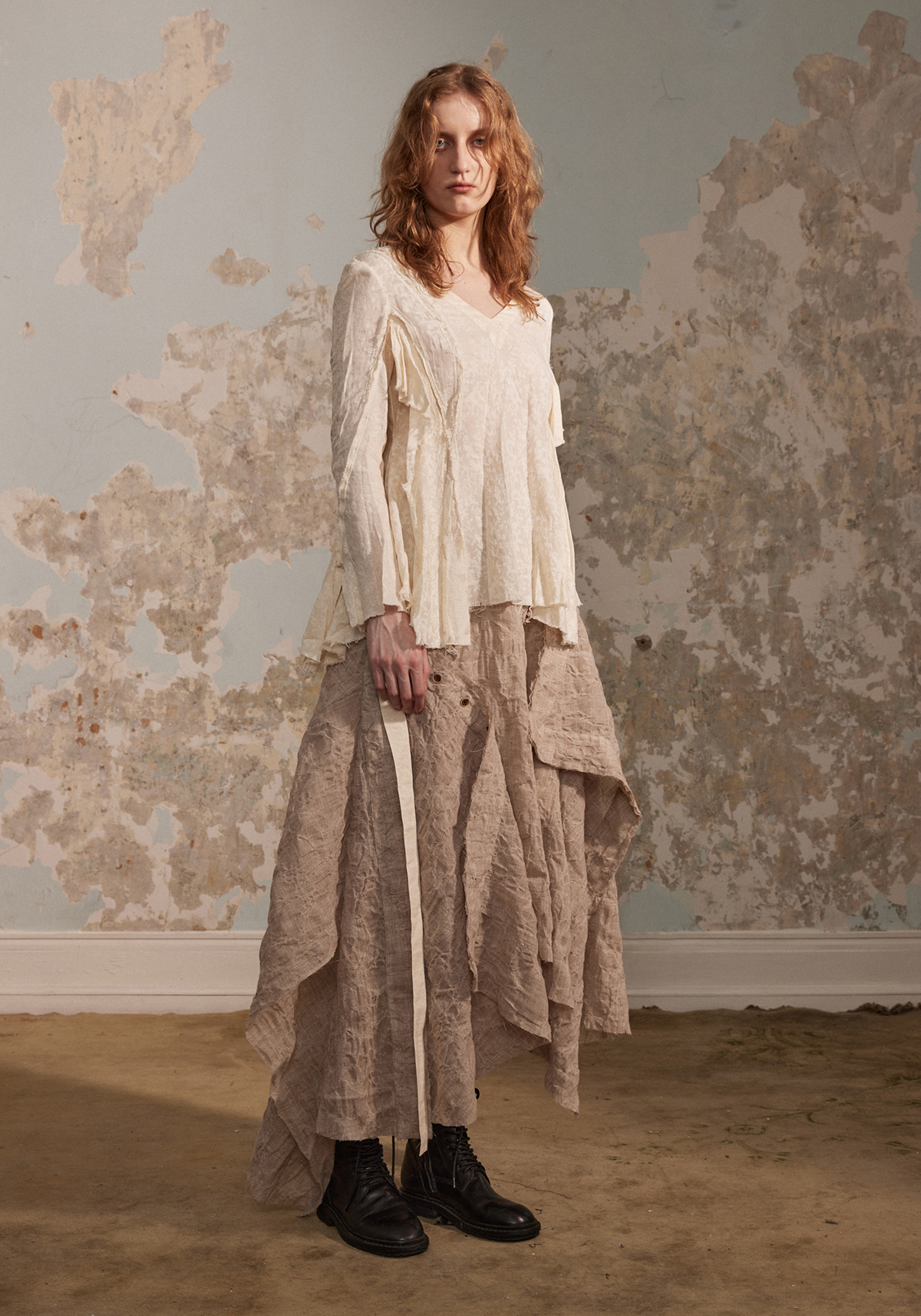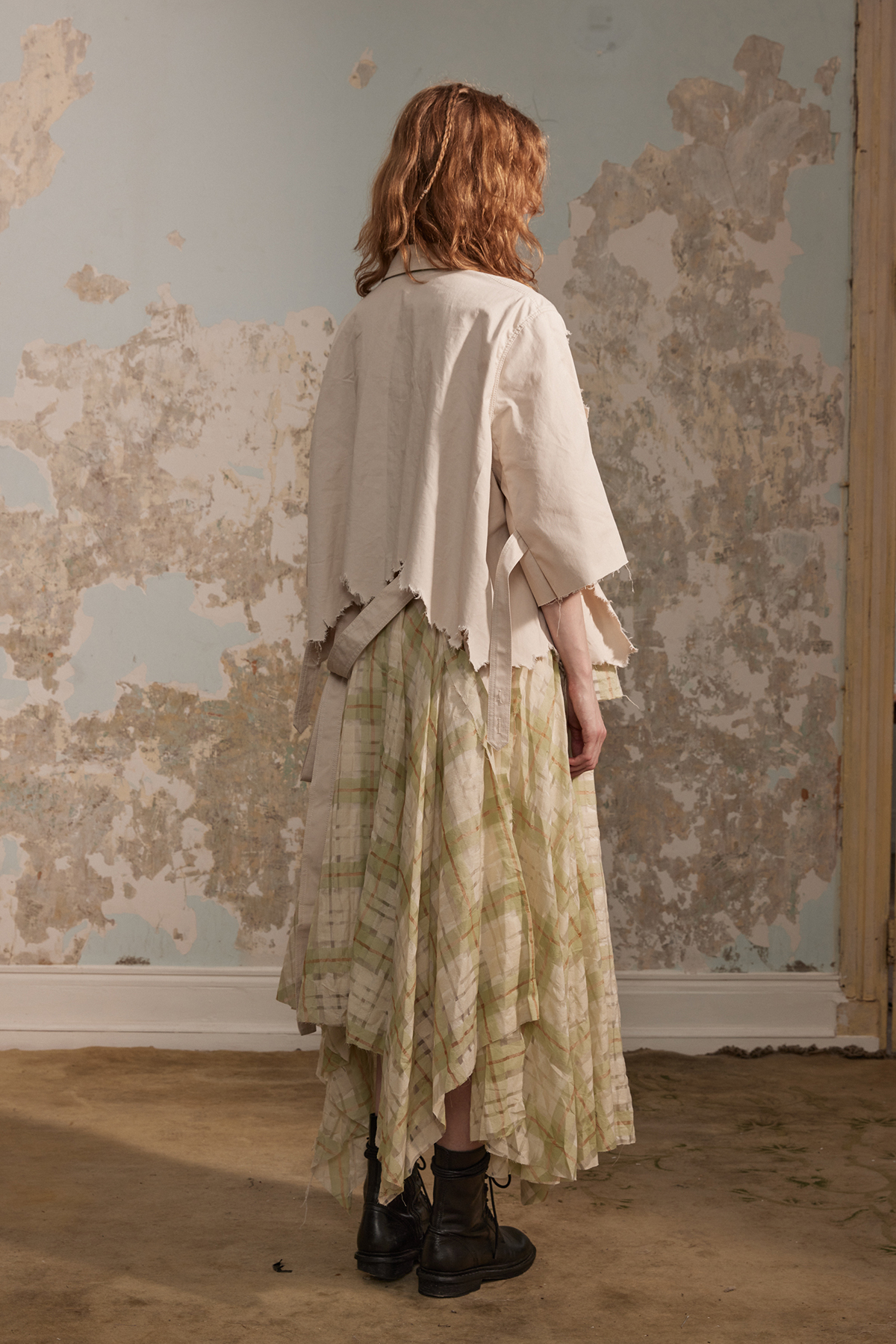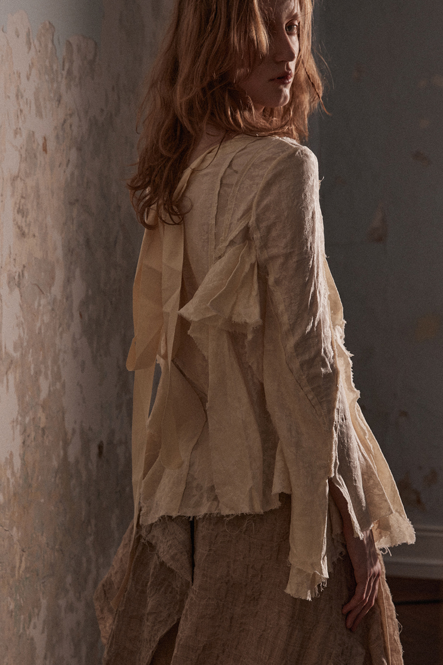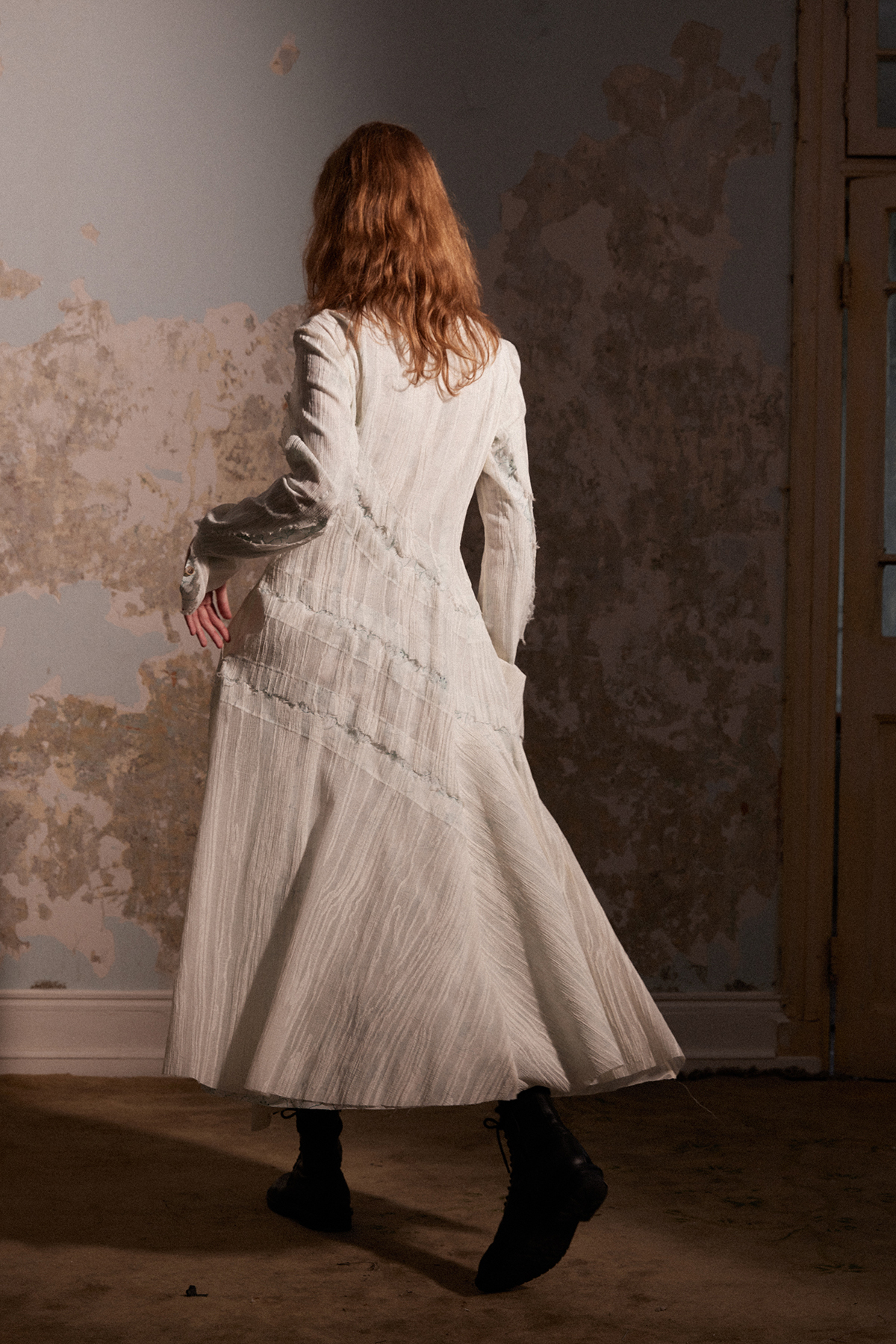Collection VIII explores the concept of clothing as a vessel—like a room that holds time and memories. Each piece is designed to be an intimate space, layering past experiences within its structure. Asymmetrical, peeled-off forms suggest the passage of time, revealing glimpses of what was once whole, yet now imperfect and worn. Faded, light hues evoke the quiet beauty of memories fading over time, which embody a sense of nostalgia and reflection. The collection aims to create a dialogue between the garment and the body, allowing them to coexist as a shared space where personal history and emotion are gently unfolded through the design.