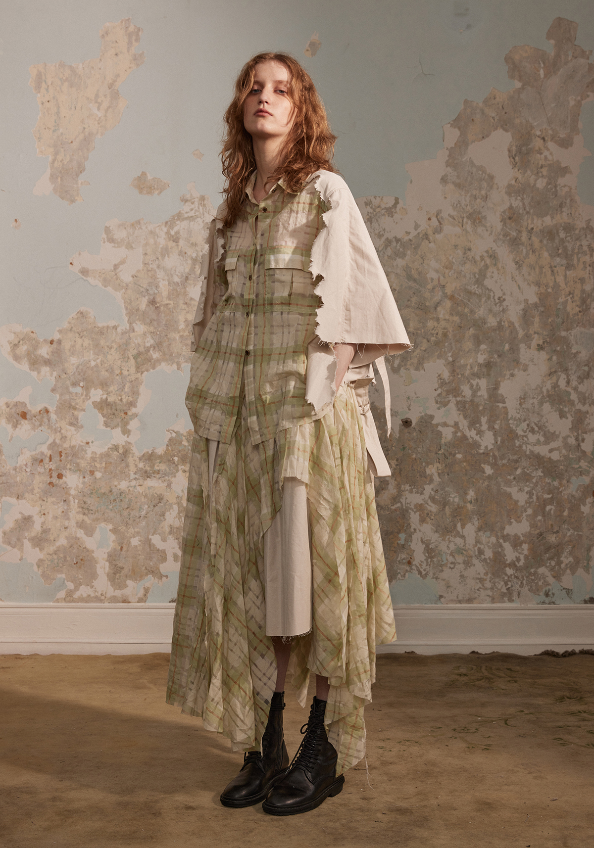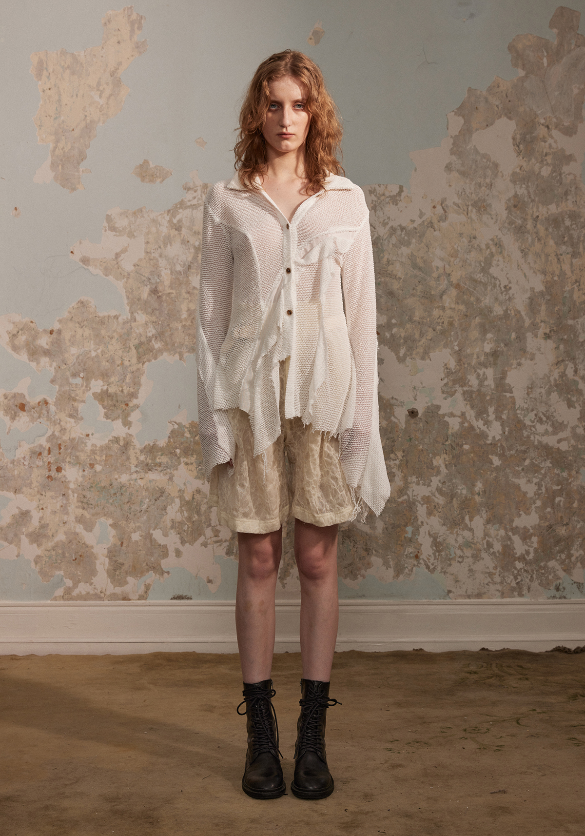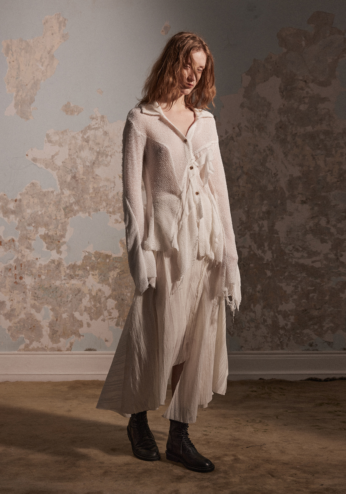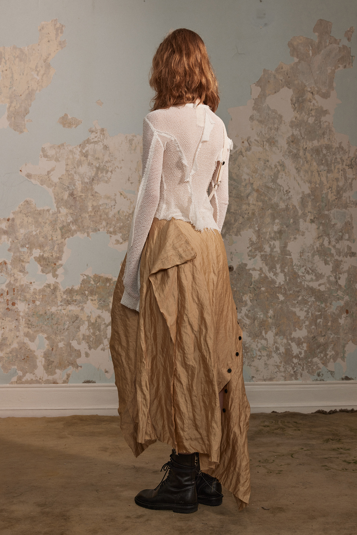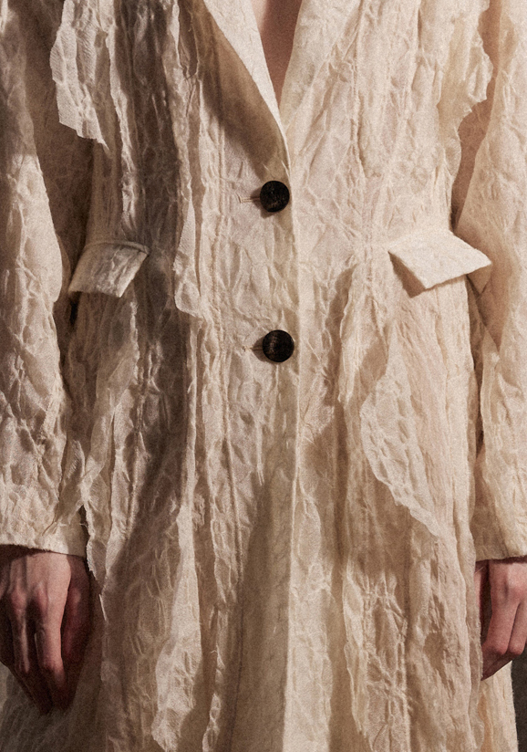 Collection VIII explores the concept of clothing as a vessel—like a room that holds time and memories. Each piece is designed to be an intimate space, layering past experiences within its structure. Asymmetrical, peeled-off forms suggest the passage of time, revealing glimpses of what was once whole, yet now imperfect and worn. Faded, light hues evoke the quiet beauty of memories fading over time, which embody a sense of nostalgia and reflection. The collection aims to create a dialogue between the garment and the body, allowing them to coexist as a shared space where personal history and emotion are gently unfolded through the design.