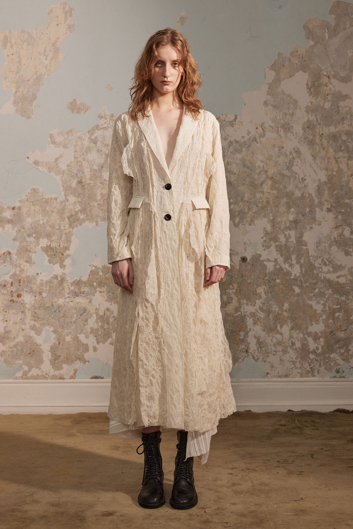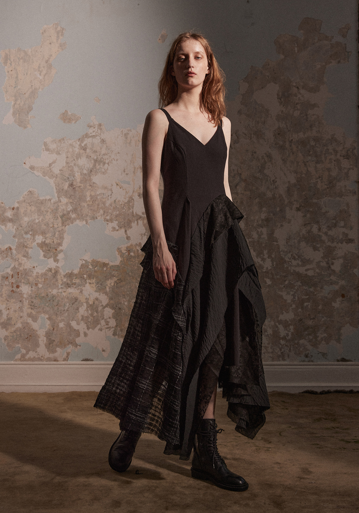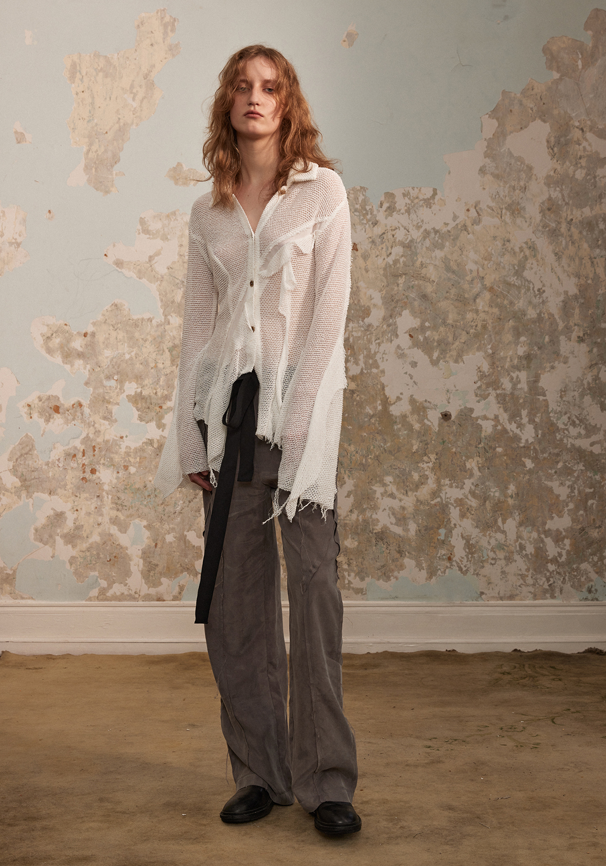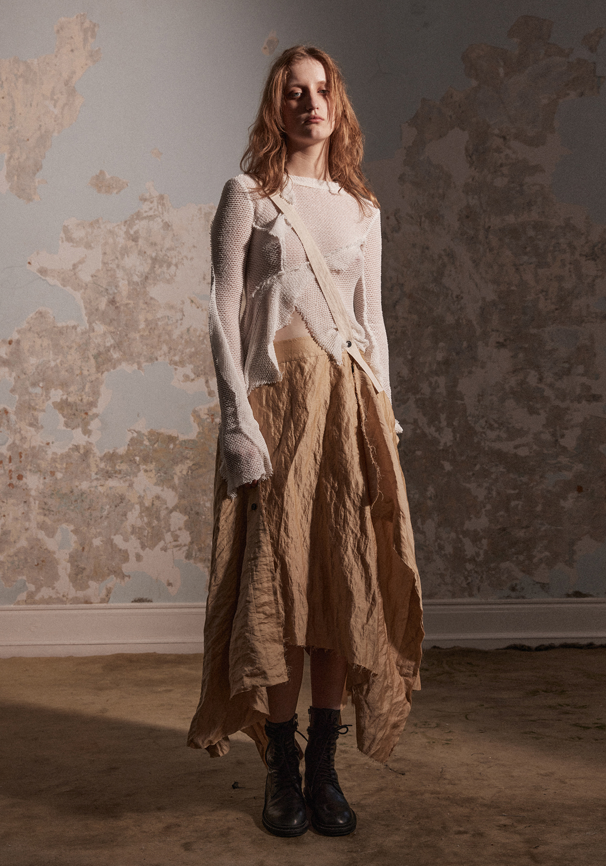 Collection VIII explores the concept of clothing as a vessel—like a room that holds time and memories. Each piece is designed to be an intimate space, layering past experiences within its structure. Asymmetrical, peeled-off forms suggest the passage of time, revealing glimpses of what was once whole, yet now imperfect and worn. Faded, light hues evoke the quiet beauty of memories fading over time, which embody a sense of nostalgia and reflection. The collection aims to create a dialogue between the garment and the body, allowing them to coexist as a shared space where personal history and emotion are gently unfolded through the design.