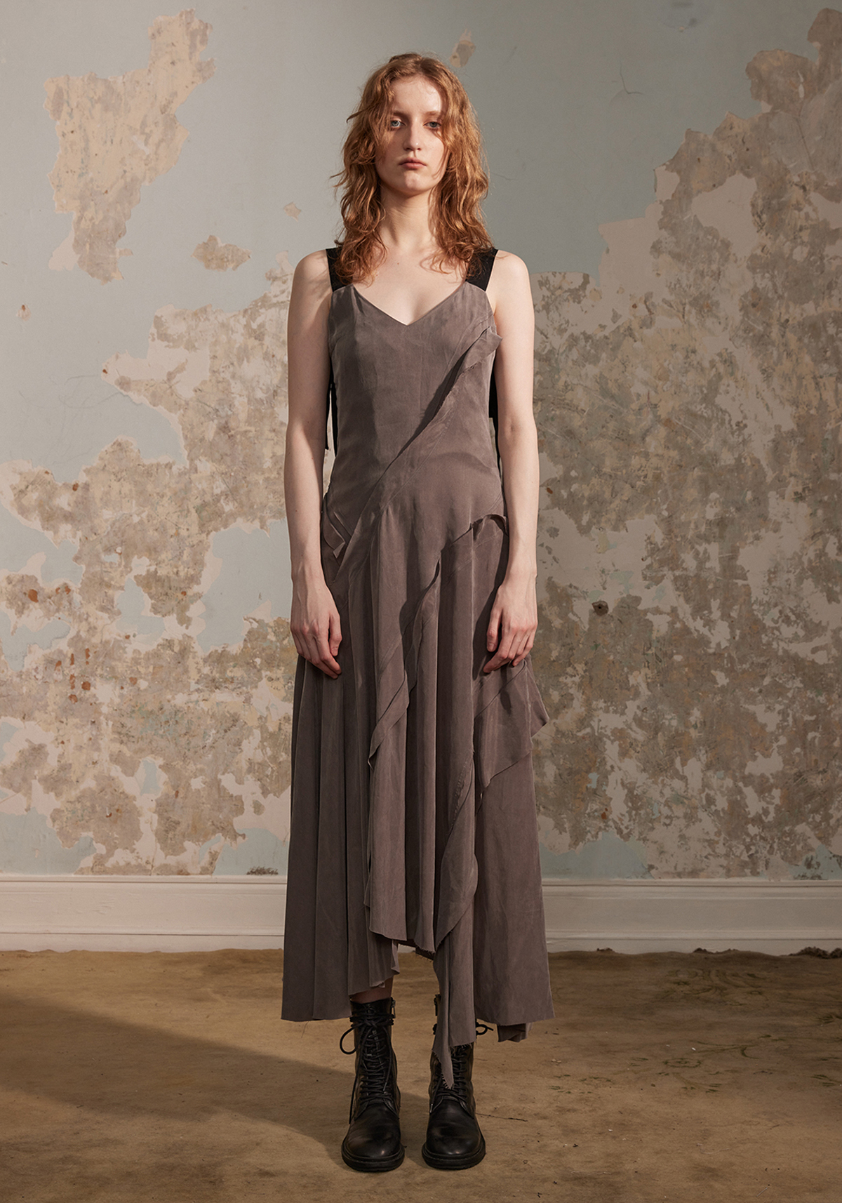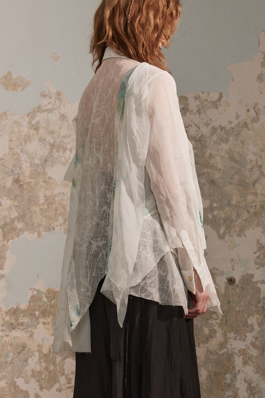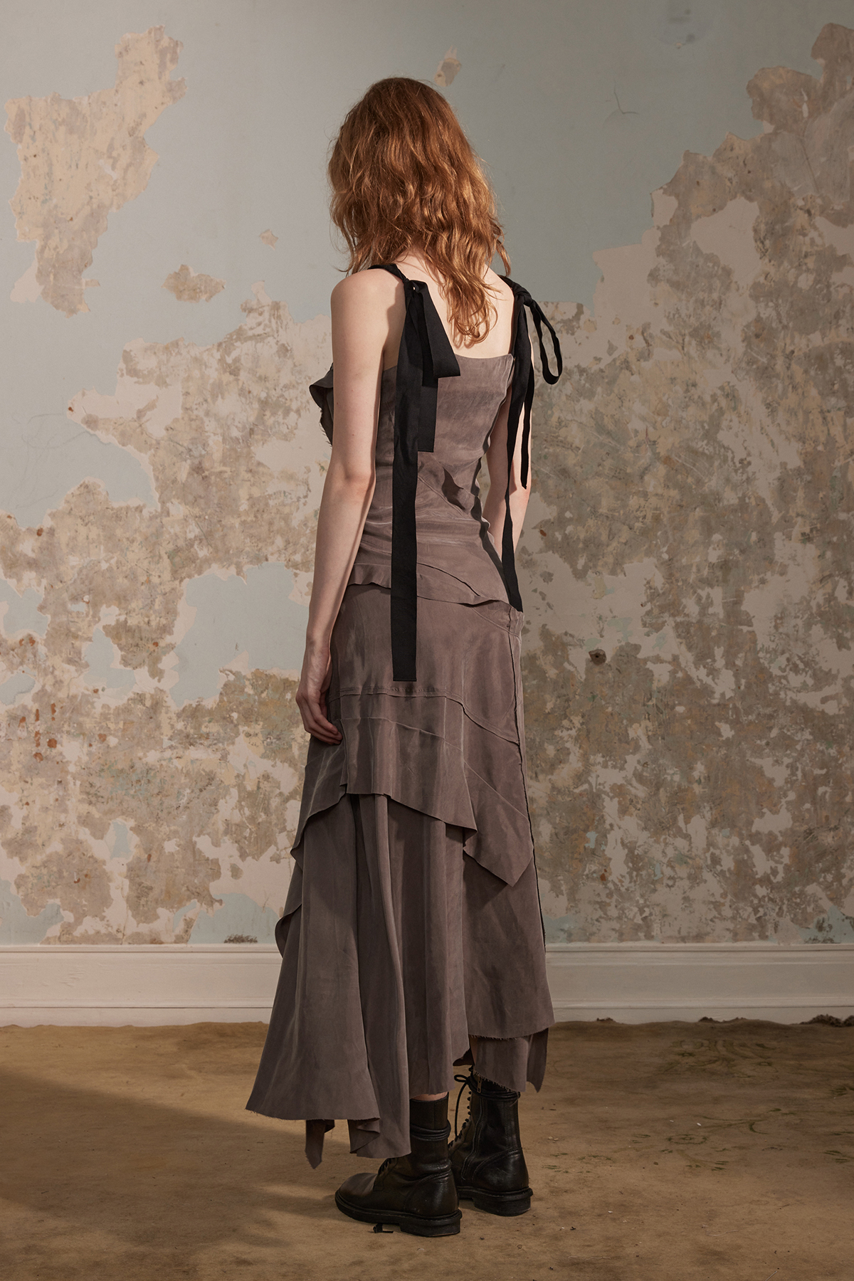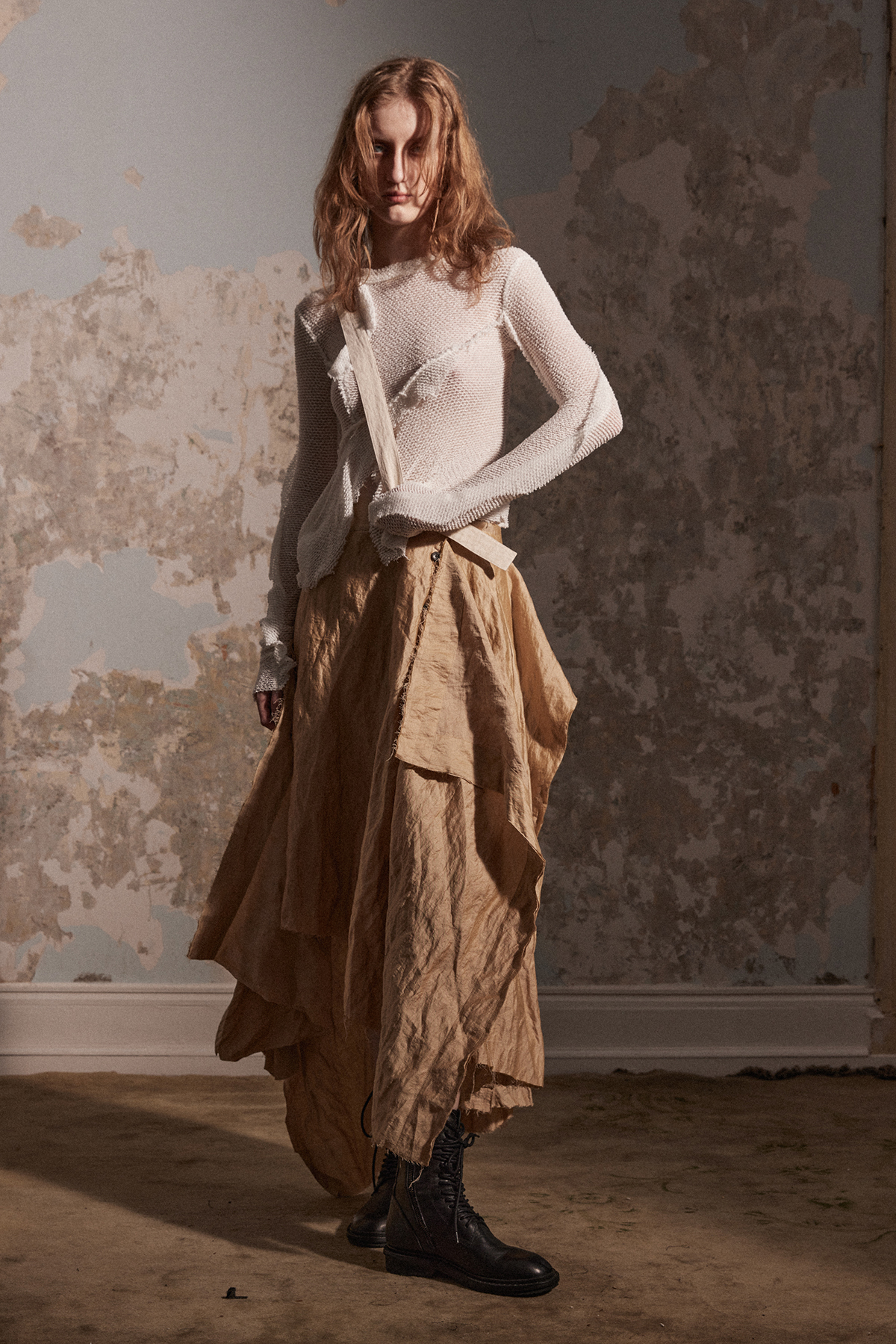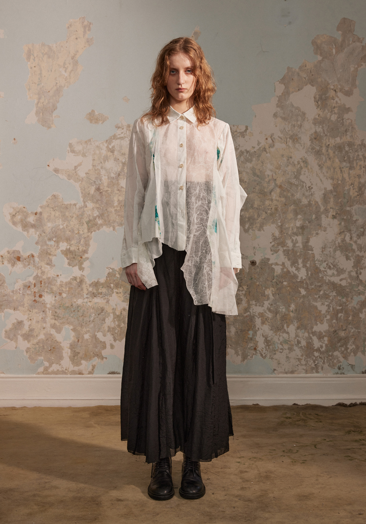 Collection VIII explores the concept of clothing as a vessel—like a room that holds time and memories. Each piece is designed to be an intimate space, layering past experiences within its structure. Asymmetrical, peeled-off forms suggest the passage of time, revealing glimpses of what was once whole, yet now imperfect and worn. Faded, light hues evoke the quiet beauty of memories fading over time, which embody a sense of nostalgia and reflection. The collection aims to create a dialogue between the garment and the body, allowing them to coexist as a shared space where personal history and emotion are gently unfolded through the design.